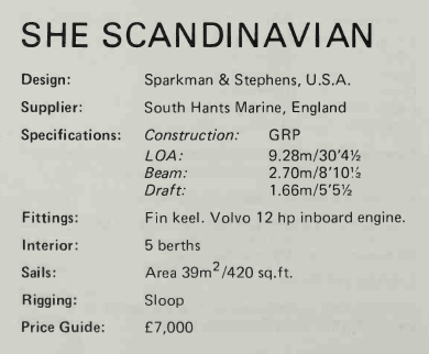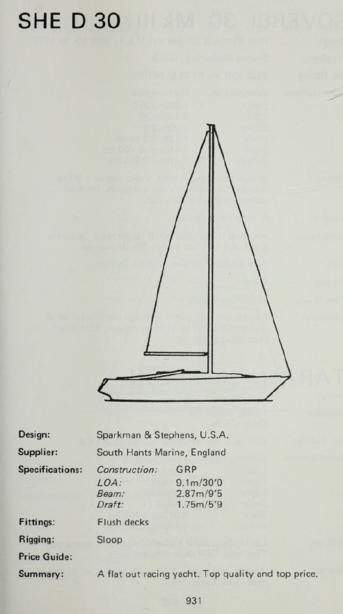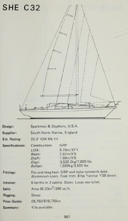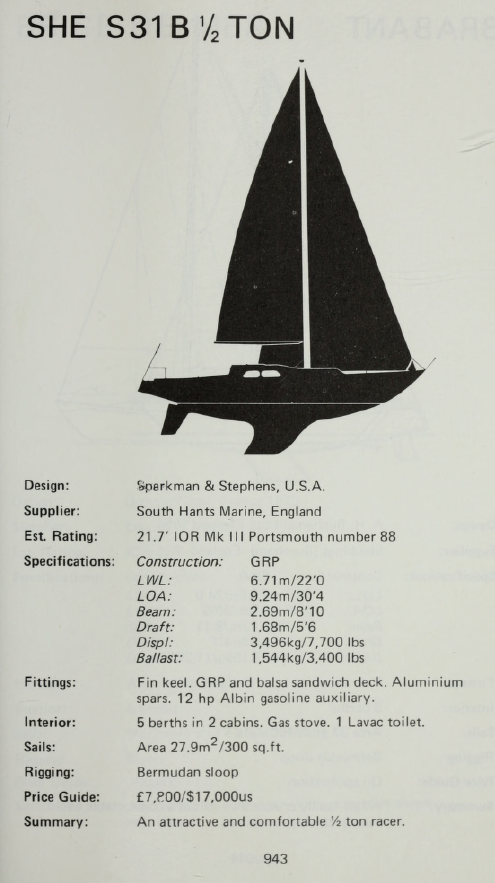 Other Notes Please note the SHE 31B produced by South Hants Engineering from 1970 onwards was an altogether different design – being Sparkman and Stephens design #2042 which was also designated for 1/2 ton IOR racing. It was further developed into the SHE 32 – a more luxurious and roomier yacht intended for cruising.