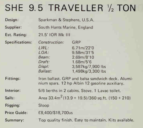 SHE 9.5 Traveller South Hants Engineering responded to public demand for a cruising model by producing the 9.5 Traveller, a version with more lavish accommodations;. It had a new deck, coachroof providing better cruising accommodations, higher topsides and increased headroom. Most owners will refer to their Traveller simply as a SHE. They are relatively rare.