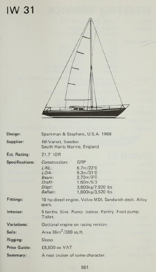 IW 31 Simultaneously with the South Hamp Engineering yachts, Swedish builder I.W. Varvet on the island of Orust, an island which traces its roots back to the time of Viking ships, produced a large number of yachts. Over 350 boats were produced starting around 1968 in three revisions.