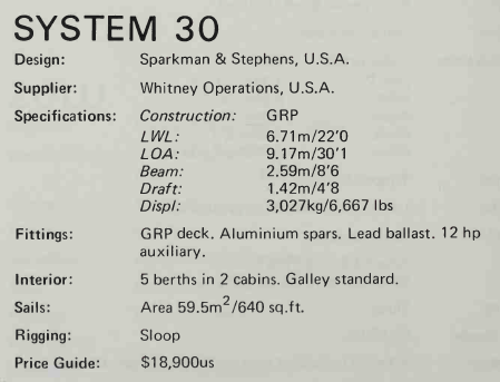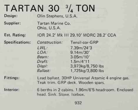 An earlier S&S 30 (S&S design 1999c) was built by Swarbrick Bros. of Australia as well as the YANKEE 30, by Yankee Yachts (USA). Thanks to Owen McCall, PJ-30 owner, for supplying information on the different versions of the S&S 30.