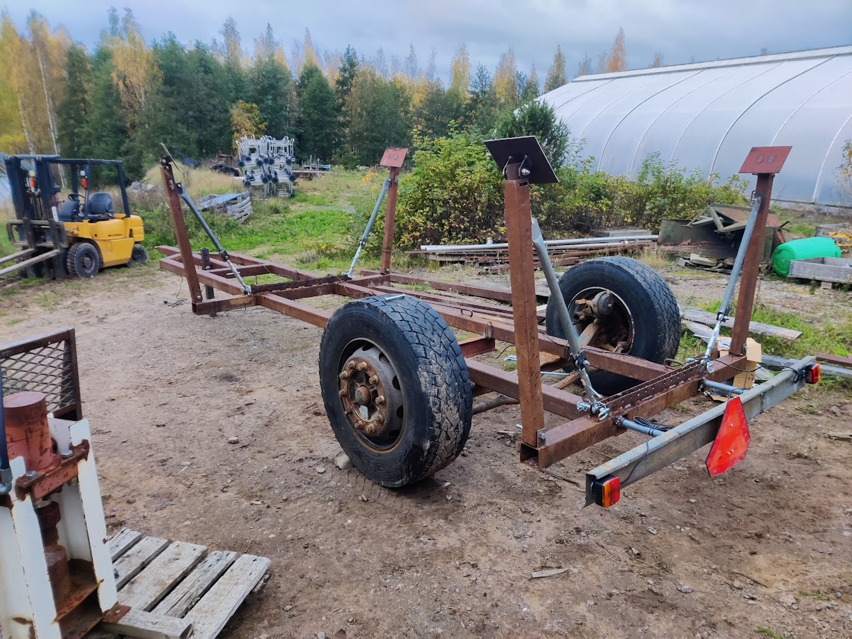 Akselin mukana tuli myös vanhat renkaat, mutta ne saivat rengasliikkeessä täystyrmäyksen huonon kuntonsa takia. Käytettyjä kuorma-auton “varapyöriä” saa kuitenkin hyvinkin sopivasti kun vannekoko on normaali 22,5“. Matalampi 315/70 R22.5 -rengas on varmaankin paras purkkarikärryyn koska näin kuljetuskorkeus jää 2-3 cm matalammaksi kuin 80-profiililla.